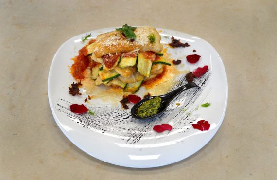CORSO CUOCO | SECONDO PIATTO PARMIGIANA DI PESCE SPADA DI SONIA BRUNELLI DIPLOMATA CORSO DI CUOCO PROFESSIONISTA INGREDIENTI PER 4 PERSONE: – filetto di spada 4,5hg – 2 zucchine fritte – passata di