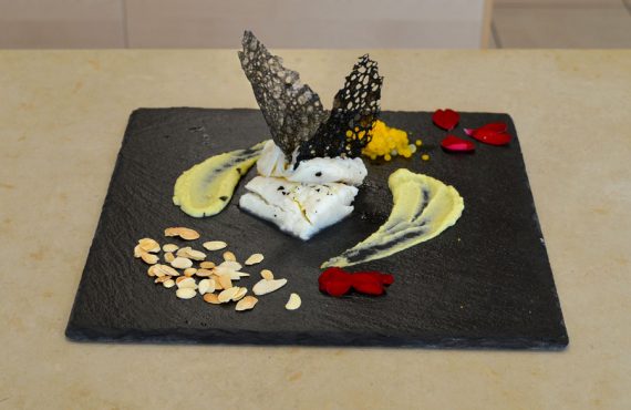 CORSO DI CUOCO | SECONDO PIATTO BACCALÀ IN COTTURA SOUS VIDE E PERLE D’AGAR AL PROFUMO D’ARANCIA SU UN LETTO DI CREMA DI LEGUMI CON CIALDA DI CEREALE NERO. DI ALICE