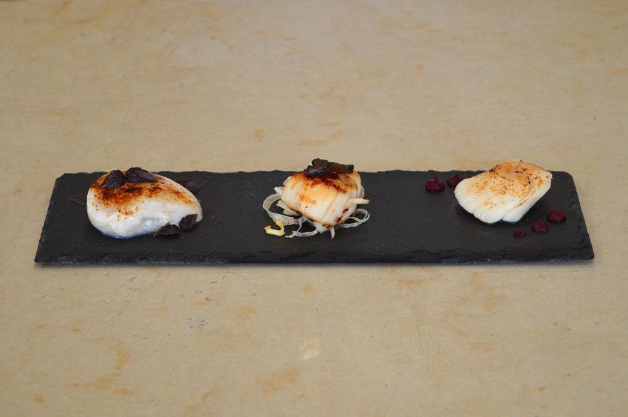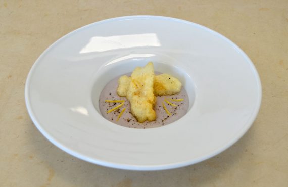 CORSO PER CUOCO | SECONDO PIATTO BACCALA’ IN TEMPURA DI PATATE SU VELLUTATA VIOLA DI ALESSIA CAPELLI DIPLOMATA CORSO DI CUOCO PROFESSIONISTA INGREDIENTI PER 4 PERSONE: Ingredienti per le capesante crude: –