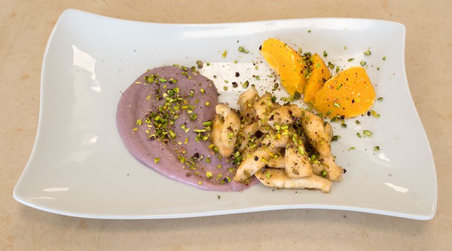Pelare a vivo le arance in modo da ottenere 12 spicchi, condire con sale e olio. Tritare i pistacchi. Impiattare e condire tutto con pepe e cospargere con i pistacchi.
