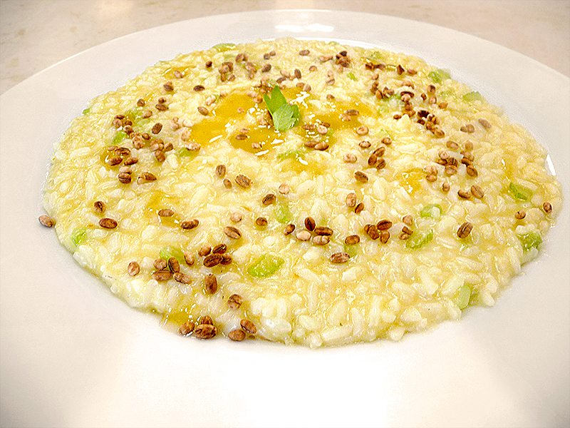 In una casseruola versare dell’olio extravergine d’oliva e far soffriggere un trito di carota, sedano, cipolla. Dopo qualche minuto inserire il riso e farlo tostare. Non appena tostato far sfumare con del vino bianco. Quando il vino sarà evaporato aggiungere poco alla volta il brodo caldo. Nel frattempo procediamo alla creazione della glassa inserendo in un pentolino lo zucchero ed il succo d’arancia, facciamolo scaldare mescolandolo fino ad ottenere la giusta consistenza. Tostare l’orzo e tenere da parte. Preparare il sedano tagliandolo in piccoli pezzetti e mescolarlo al riso 5 minuti prima di fine cottura. Inserire il parmigiano reggiano il burro e mantecare il tutto facendo riposare per 2 minuti. Impiattare il riso, aggiungere la glassa e decorare con l’orzo tostato.