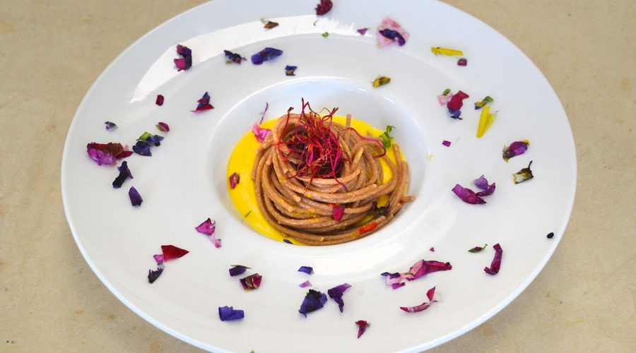 Per realizzare la crema di cavolfiore, stufare il cavolfiore per 20 min, passara le cimette di cavolfiore al minipimer con la panna, lo zafferano, brodo e sale. Per gli spaghetti alla bottarga invece iniziare a tritare uno spicchio d’aglio e un peperoncino, metterli in una padella con olio e.v.o. E soffrigere il tutto finche l’aglio non appare leggermente dorato. Inanto cuocere gli spaghetti in acqua bollente salata. Quando gli spaghetti saranno al dente toglierli dall’acqua e saltarli in padella con con l’aglio e il peperoncino, spegnere il fuoco e aggiungere la bottarga.