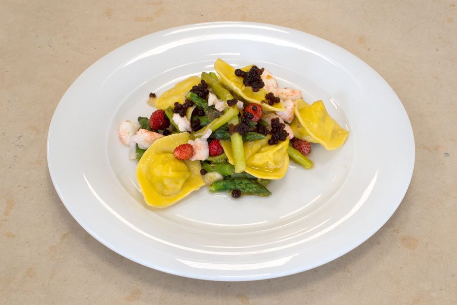 Possiamo utilizzare un piatto di forma quadrata o circolare in quanto utilizzeremo il centro del piatto. Spalmare un paio di cucchiai di crema di asparagi e mandorle al centro del piatto. Posizionare sulla crema qualche asparago di quelli saltati in padella e qualche pezzetto di scampo a creare volume. Posizionare i tortelli in forma circolare con la punta rivolta verso il centro del piatto. Finire di coprire i tortelli con il condimento. Guarnire con la sferificazione di balsamico e con i frutti rossi.