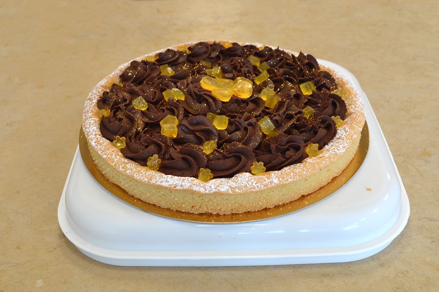 Da qui è nata la sua crostata con crema all’arancia e ganache al cioccolato fondente decorata con gelèe di arancia.