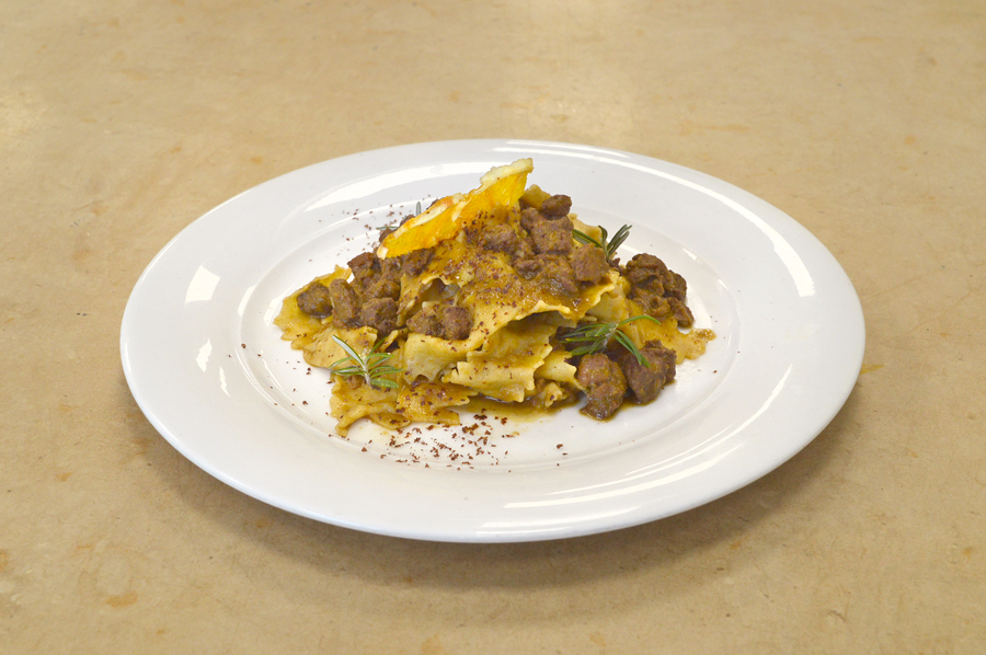 Alessio ha sottoposto alla valutazione della Commissione un primo piatto a base di pappardelle rustiche integrali con anatra, profumo di arancia e cioccolato. Il piatto è piaciuto molto alla Commissione per la scelta degli ingredienti e degli accostamenti. Molto apprezzata la capacità del Candidato nel bilanciare i sapori. Alessio si è diplomato con la massima votazione di 100/100 ottenendo anche uno speciale riconoscimento riservato agli allievi più meritevoli.